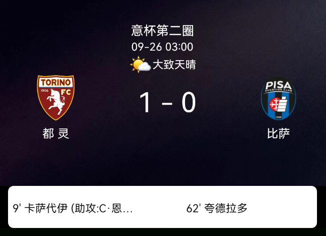 北京时间9月26日意大利杯第二轮,都灵主场迎战比萨。都灵早段凭借关键助攻与破门建立优势,比萨下半场因红牌减员无力翻盘,最终比分,都灵1-0比萨。关键事件第9分钟(进球):都灵打破僵局!恩贡戈送出助攻,切萨雷-…