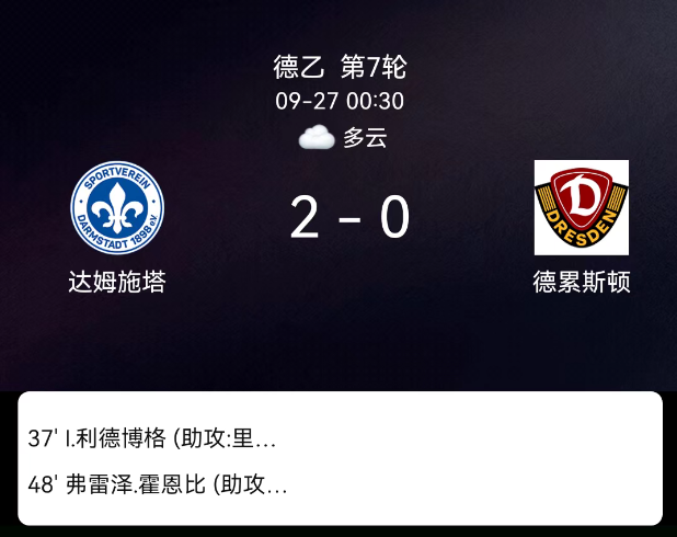 北京时间9月27日德国足球乙级联赛(德乙)第7轮,达姆施塔特98坐镇主场迎战德累斯顿迪纳摩。主队上下半场各入一球建立稳固优势,最终顺利拿下胜利,最终比分,达姆施塔特982-0德累斯顿迪纳摩。关键事件第37分钟(进球…