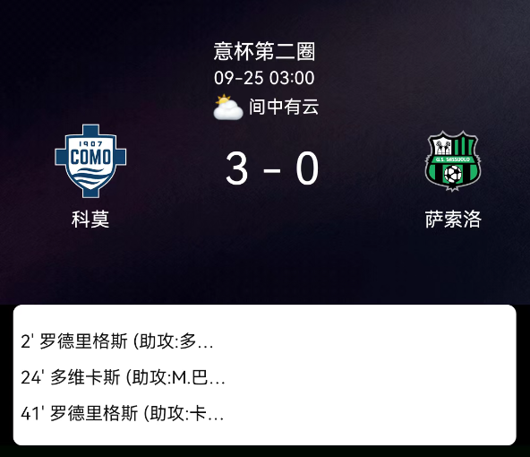 北京时间9月25日意大利杯第二轮,科莫迎战萨索洛。科莫上半场火力全开连入三球,早早锁定胜局并顺利晋级,最终比分,科莫3-0萨索洛。关键事件第2分钟(进球):科莫闪电破局!杜维卡斯送出助攻,赫苏斯-罗德里格斯接…