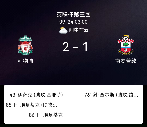 北京时间9月24日3:00英格兰联赛杯(英联杯)第三轮,利物浦坐镇安菲尔德球场迎战南安普顿(圣徒)。上半场红军先拔头筹,下半场双方交替进球,埃基蒂克绝杀后染红,主队终局取胜晋级,最终比分,利物浦2-1南安普顿。…