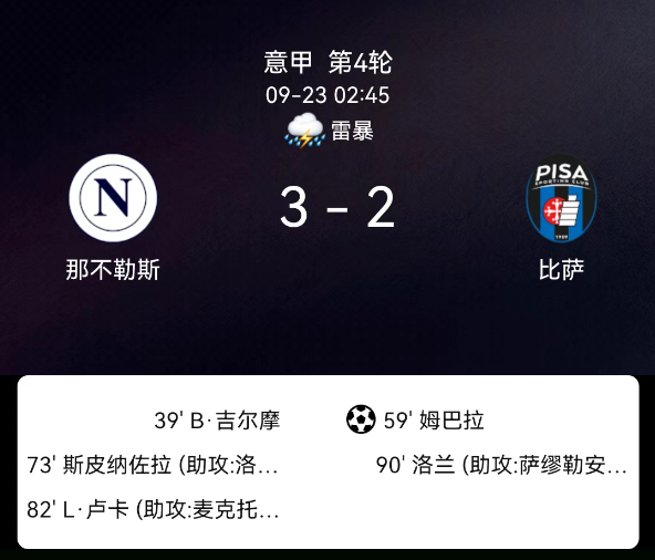 北京时间10月5日,意大利足球顶级联赛第6轮,博洛尼亚主场迎战比萨。第24分钟达林加助攻坎比亚吉破门为博洛尼亚首开纪录,第36分钟比萨伊德里萨-图雷染红离场;第38分钟莫罗破门扩大比分,第40分钟坎比亚吉助攻奥尔索…