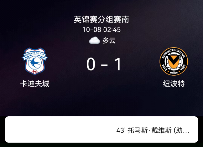 北京时间10月8日,英格兰联赛锦标赛小组赛南区,卡迪夫城主场迎战纽波特。第25分钟卡迪夫城球员因中场拼抢犯规先吃黄牌,第38分钟纽波特后卫拦截动作过大领黄;上半场临近尾声,第43分钟卡伊-惠特莫尔送出助攻,汤姆…