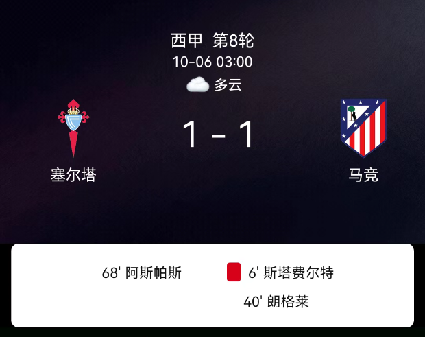 北京时间10月6日,西班牙足球甲级联赛第8轮,塞尔塔主场迎战马德里竞技。第6分钟斯塔费尔特解围失误自摆乌龙,助马竞1-0领先;第25分钟马竞朗格莱拉拽犯规领首黄,第41分钟其再因拉人犯规两黄变一红被罚下;下半场第…