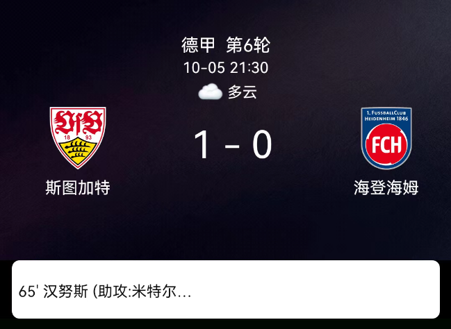 北京时间10月5日,德甲联赛第6轮,斯图加特主场迎战海登海姆。第55分钟斯图加特球员先吃黄牌,第64分钟海登海姆卢卡-克伯染黄,第65分钟米特尔施泰特助攻哈努斯打入制胜球,最终比分,斯图加特1-0海登海姆。关键事件…