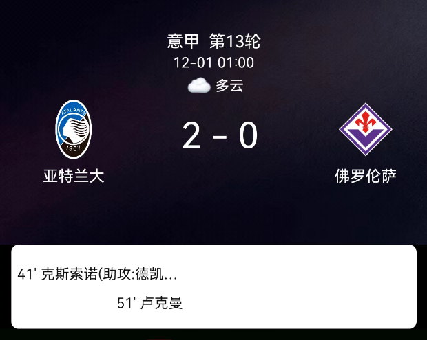 北京时间12月1日,意大利足球甲级联赛第13轮,亚特兰大主场对阵佛罗伦萨。第40分钟奥迪隆破门,1-0;第51分钟卢克曼破门,2-0;亚特兰大1黄、佛罗伦萨3黄;无红牌。最终比分,亚特兰大2-0佛罗伦萨。关键事件第40分钟…