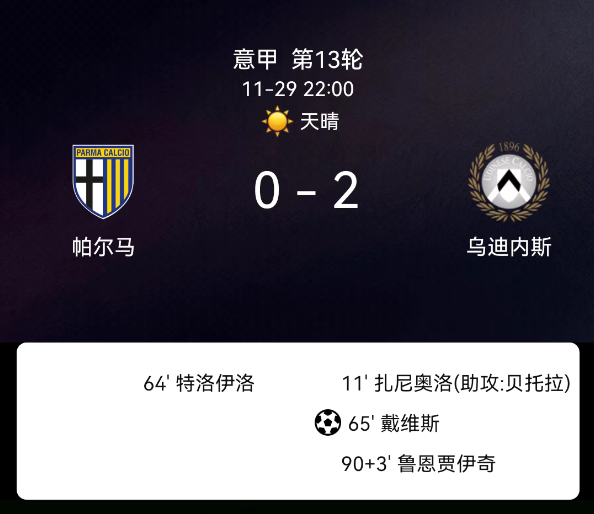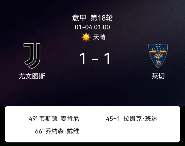 北京时间1月3日19:30,2025-2026赛季意大利足球甲级联赛第18轮,科莫主场对阵乌迪内斯。第18分钟达库尼亚点球破门,1-0;第55分钟扎尼奥洛破门越位无效;双方无红黄牌。最终比分,科莫1-0乌迪内斯。关键事件第18分钟…