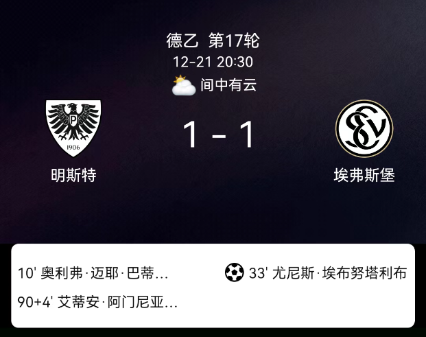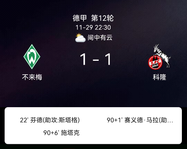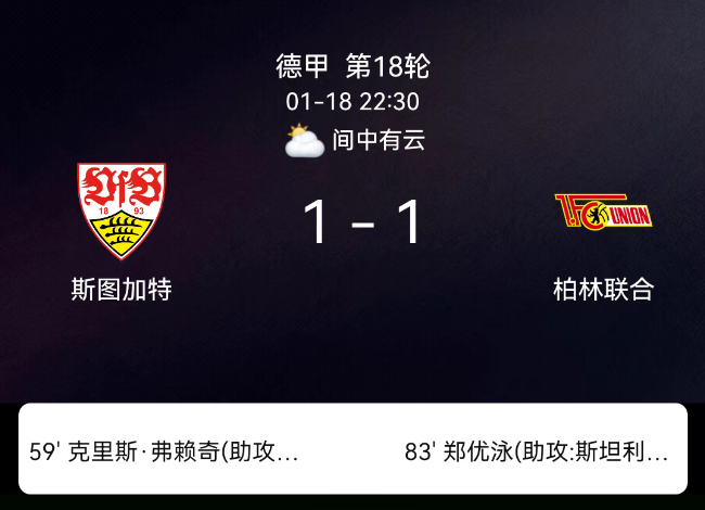 北京时间1月18日,2023-2024赛季德国足球甲级联赛第18轮,斯图加特主场对阵柏林联合。第59分钟菲里希破门,1-0;第83分钟郑优营破门,1-1;双方各1黄,无红牌。最终比分,斯图加特1-1柏林联合。关键事件第59分钟(进…