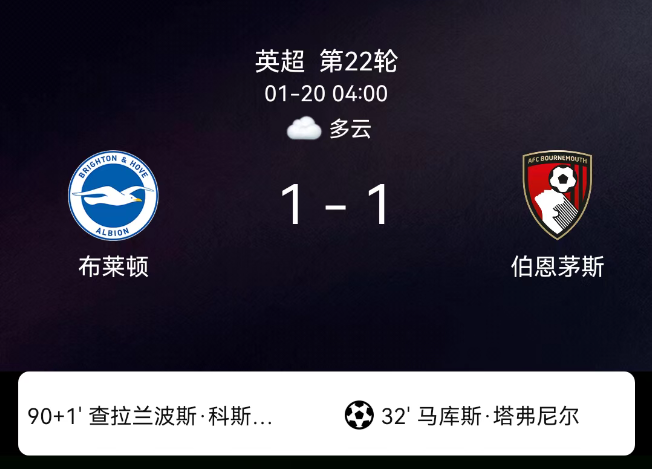北京时间1月20日,2025-2026赛季英格兰足球超级联赛第22轮,布莱顿主场对阵伯恩茅斯。第33分钟塔韦尼耶点射,0-1;第90分钟科斯图拉斯倒钩破门,1-1;双方各1黄,无红牌。最终比分,布莱顿1-1伯恩茅斯。关键事件第33…
