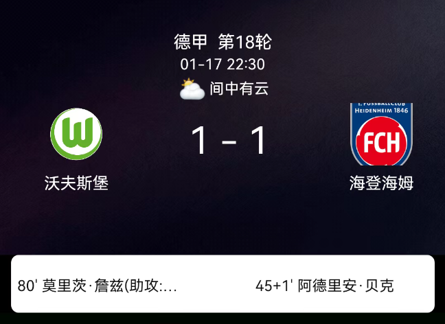 北京时间1月17日,2023-2024赛季德国足球甲级联赛第18轮,沃尔夫斯堡主场对阵海登海姆。上半场补时1分钟贝克破门,0-1;第80分钟延茨破门,1-1;双方各1黄,无红牌。最终比分,沃尔夫斯堡1-1海登海姆。关键事件上半场…