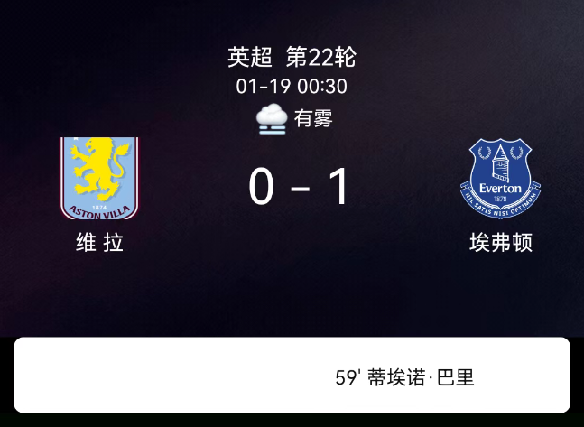 北京时间1月19日,2025-2026赛季英格兰足球超级联赛第22轮,阿斯顿维拉主场对阵埃弗顿。第59分钟巴里破门,0-1;双方各1黄,无红牌。最终比分,阿斯顿维拉0-1埃弗顿。关键事件第59分钟(进球):埃弗顿打破僵局!保-…