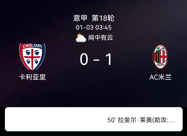 北京时间1月3日03:45,2025-2026赛季意大利足球甲级联赛第18轮,卡利亚里主场对阵ac米兰。第49分钟莱奥破门,0-1;双方无红黄牌。最终比分,卡利亚里0-1ac米兰。关键事件第49分钟(进球):ac米兰打破僵局!拉比奥右…