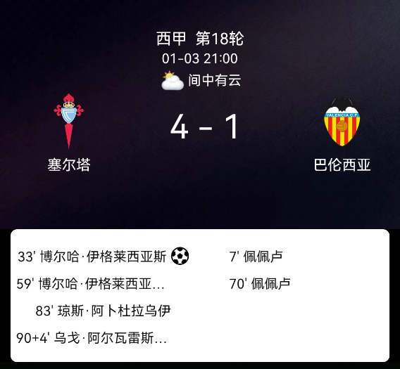 北京时间1月3日23:15,2025-2026赛季西班牙足球甲级联赛第18轮,塞尔塔主场对阵瓦伦西亚。第33分钟博尔哈-伊格莱西亚斯点球破门,1-0;第59分钟博尔哈-伊格莱西亚斯再破门,2-0;第70分钟佩佩卢破门,2-1;第83分钟阿…