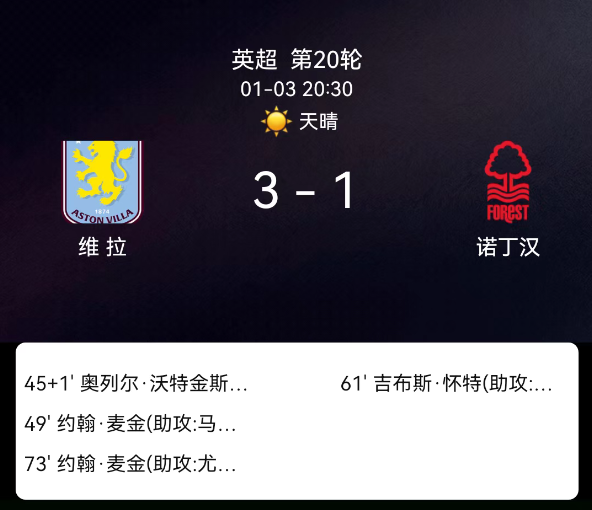 北京时间1月3日20:30,2025-2026赛季英格兰足球超级联赛第20轮,阿斯顿维拉主场对阵诺丁汉森林。第45+1分钟沃特金斯破门,1-0;第49分钟麦金破门,2-0;第61分钟吉布斯-怀特破门,2-1;第73分钟麦金再破门,3-1;阿斯…