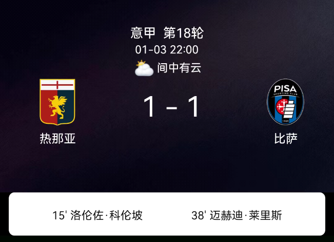 北京时间1月3日22:00,2025-2026赛季意大利足球甲级联赛第18轮,热那亚主场对阵比萨。第15分钟洛伦佐-科隆博破门,1-0;第38分钟莱里斯破门,1-1;双方无红黄牌。最终比分,热那亚1-1比萨。关键事件第15分钟(进球)…