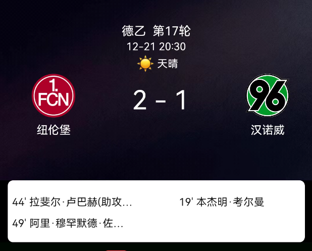 北京时间12月21日,2025赛季德国足球乙级联赛第17轮,纽伦堡主场对阵汉诺威96。第31分钟纽伦堡领首黄;第19分钟凯尔曼破门,0-1;第44分钟卢巴赫扳平,1-1;第49分钟穆罕默德-佐马反超,2-1;全场共6黄、无红牌。最终…