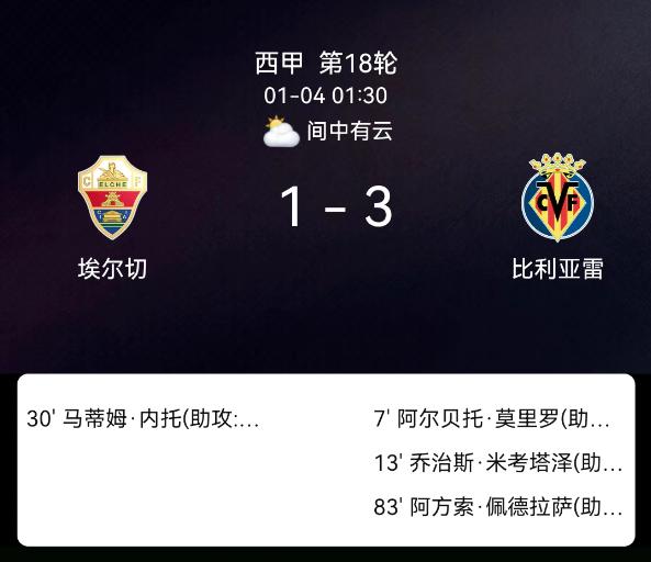 北京时间1月4日01:30,2025-2026赛季西班牙足球甲级联赛第18轮,埃尔切主场对阵比利亚雷亚尔。第7分钟莫莱罗破门,0-1;第13分钟米卡塔泽破门,0-2;第30分钟马蒂姆-内托破门,1-2;第83分钟佩德拉萨破门,1-3;埃尔…