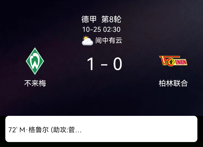 北京时间10月25日,2025-2026赛季德国足球甲级联赛第8轮,云达不莱梅迎战柏林联合。第55分钟,柏林联合球员吃黄;第72分钟,格吕尔破门,云达不莱梅1-0;第88分钟,云达不莱梅球员吃黄。最终比分,云达不莱梅1-0柏林…