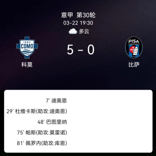 北京时间3月22日21:22,意大利足球甲级联赛第30轮,科莫主场迎战比萨。整场比赛科莫完全掌控局势,进攻端多点开花,早早奠定胜局。第7分钟阿萨内-迪奥率先破门打开局面,第29分钟他又送出助攻,杜维卡斯扩大领先优势…