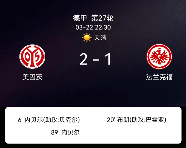 北京时间3月23日00:28,德国足球甲级联赛第27轮,美因茨主场迎战法兰克福。比赛开场仅6分钟,贝克尔送出助攻,内贝尔门前抢点破门,帮助美因茨迅速取得领先。第20分钟,法兰克福由巴霍亚助攻纳撒尼尔-布朗扳平比分,…