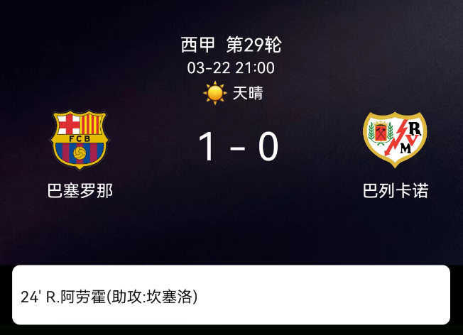 北京时间3月22日21:00,西班牙足球甲级联赛第29轮,巴塞罗那主场迎战巴列卡诺。上半场巴萨掌控比赛节奏,第24分钟坎塞洛开出角球,阿劳霍头球击中立柱弹入网内,打入全场唯一进球。下半场巴列卡诺多次发起反击,埃斯…