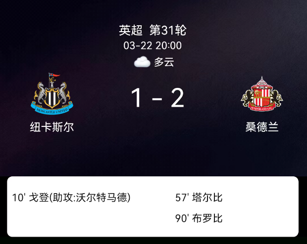 北京时间3月22日21:57,英格兰足球超级联赛第31轮,纽卡斯尔联主场迎战桑德兰德比大战。第10分钟奥尼安出球失误,安东尼-戈登抓住机会破门,纽卡主场1-0领先。上半场双方对抗激烈,博特曼头球中柱,纽卡险些扩大比分…