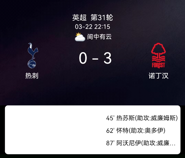 北京时间3月23日00:12,英格兰足球超级联赛第31轮,托特纳姆热刺主场迎战诺丁汉森林。上半场临近结束阶段,诺丁汉森林利用角球机会由伊戈尔-热苏斯头球破门,率先取得1-0领先。下半场热刺防线依旧漏洞百出,第62分钟…