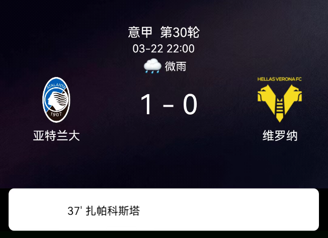 北京时间3月22日23:52,意大利足球甲级联赛第30轮,亚特兰大主场迎战维罗纳。上半场双方攻防节奏紧凑,维罗纳多次制造威胁,克尔斯托维奇的头球被门将神勇化解。第38分钟亚特兰大打出精彩进攻,扎帕科斯塔带球内切后…