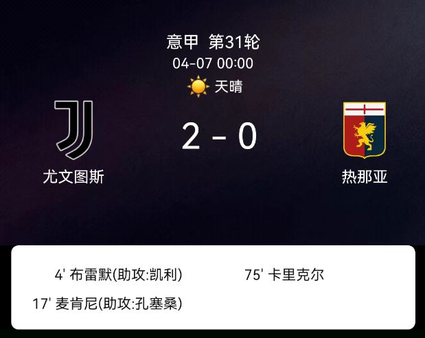 北京时间4月7日,意甲第31轮,尤文图斯主场迎战热那亚。开场第4分钟,布雷默门前头球折射破门,为尤文先拔头筹。第17分钟,孔塞桑右路横传,麦肯尼中路包抄推射再下一城,尤文早早取得两球领先。半场尾声麦肯尼错失近…