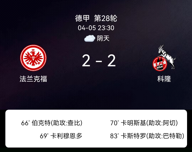 北京时间4月5日,德国足球顶级联赛第28轮,法兰克福主场对阵科隆。上半场双方防守严密,进攻端均未能创造出绝佳破门机会,半场以0-0互交白卷。下半场比赛突然进入高潮,第66分钟沙伊比助攻伯卡特破门,法兰克福打破僵…