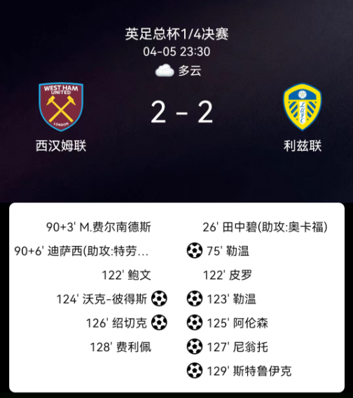 北京时间4月5日23:30,足总杯1/4决赛,西汉姆联对阵利兹联。上半场双方攻势不断,奥卡福尔与鲍恩的射门均被门将化解,第26分钟田中碧接奥卡福尔助攻折射破门,利兹联取得领先。下半场第75分钟阿伦森造点,勒温主罚命…