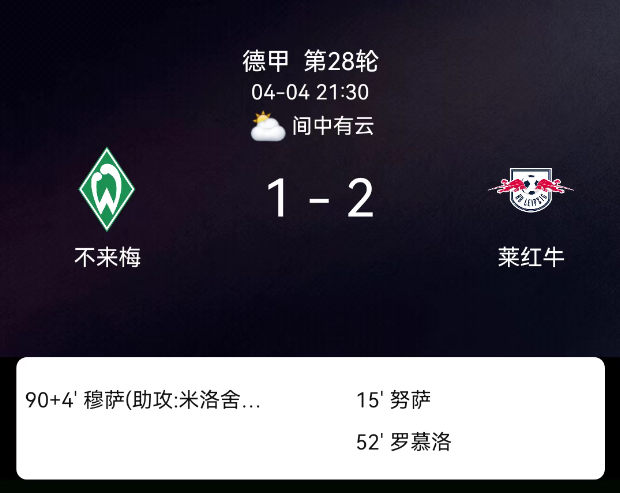 北京时间3月1日德甲第24轮,斯图加特对阵沃尔夫斯堡。第21分钟昂达夫破门1-0;第30分钟莱韦林破门2-0;第42分钟莱韦林再入3-0;补时阶段纳尔泰破门4-0;双方无红黄牌。最终比分,斯图加特4-0沃尔夫斯堡。关键事件第2…