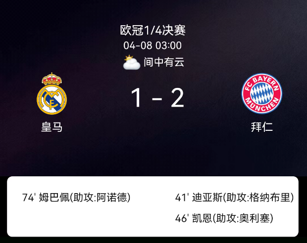 北京时间4月8日,欧冠1/4决赛首回合,皇家马德里主场迎战拜仁慕尼黑。上半场双方对抗激烈,姆巴佩与维尼修斯多次制造威胁均被诺伊尔化解,第41分钟格纳布里直塞助攻路易斯-迪亚斯推射破门,拜仁率先取得领先。下半场…