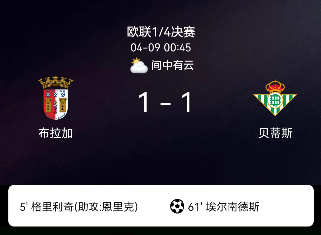 北京时间4月9日,欧足联欧洲联赛1/4决赛首回合,布拉加主场对阵皇家贝蒂斯。比赛开场仅5分钟便迎来进球,格里利奇凭借一记巧妙的脚后跟破门完成闪击,帮助布拉加迅速取得1-0领先。随后贝蒂斯展开反扑,第6分钟巴尔特…